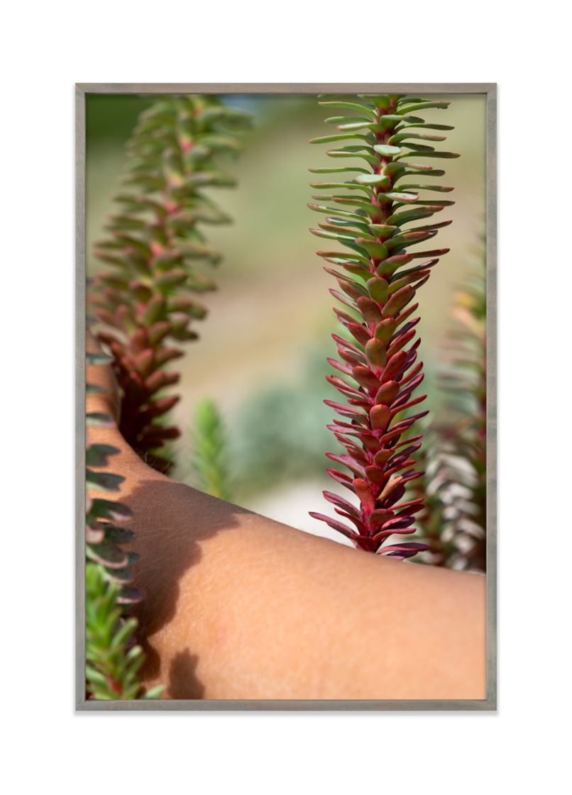 In the photographic series »2Dbody3Dcode«, an immediate relationship between being human, physical and digital worlds is traced and new starting points, connections and openings are sought, which imagine a future beyond capitalist, colonialist and exploitative concepts of life. Thereby, one’s own body directly becomes material; different materialities come into contact with each other. What connections are drawn between patterns of nature and computer generated algorithms that structure our everyday lives ever more comprehensively? With the quote of the philosopher Yuk Hui in mind: »Our computers, smartphones, and domestic robots are no longer mechanical but are rather becoming organic.« nature is observed and an attempt is made to discover interfaces between the experience of nature and digital logics in the landscapes.