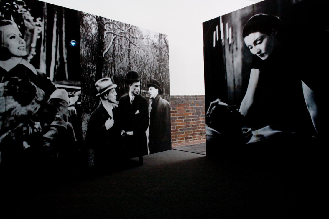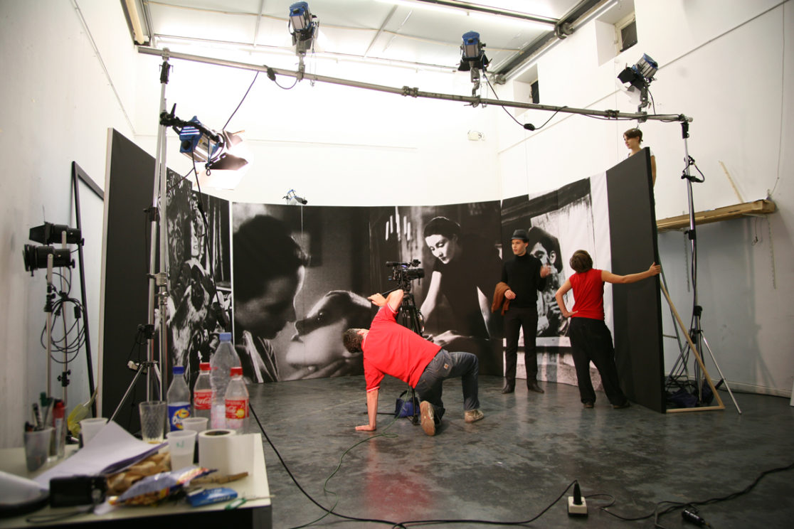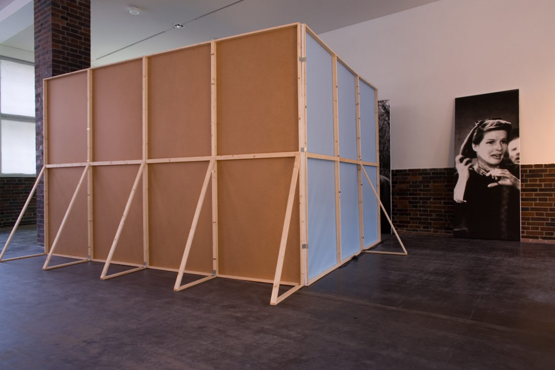 installation: 11 flats with mounted film still prints, 400 x 400 x 250 cm, 3 custom-made stools