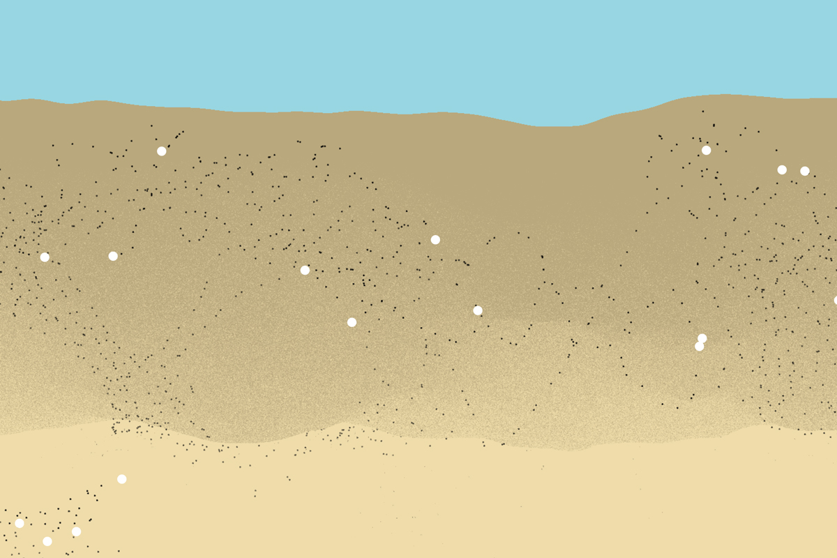 Different stories have happened, people running up the dunes (»How to Runup«), wind arranging the sand around a small bamboo stick, almost mirroring the shape of it (»Move #1«), and in »Encounter (Photographer, Calidris, Food, Wave)« we see the result of a delicate constellation between calidris birds foraging, sea waves and the photographer. The wave approaches the beach and retrieves, the calidris run to the spot, start picking for food. The photographer fathoms the perfect distance, in which the birds allow pers present, without flying away, and at the same time close enough in order to capture the picking and walking traces before the follow up wave washes away the pattern.