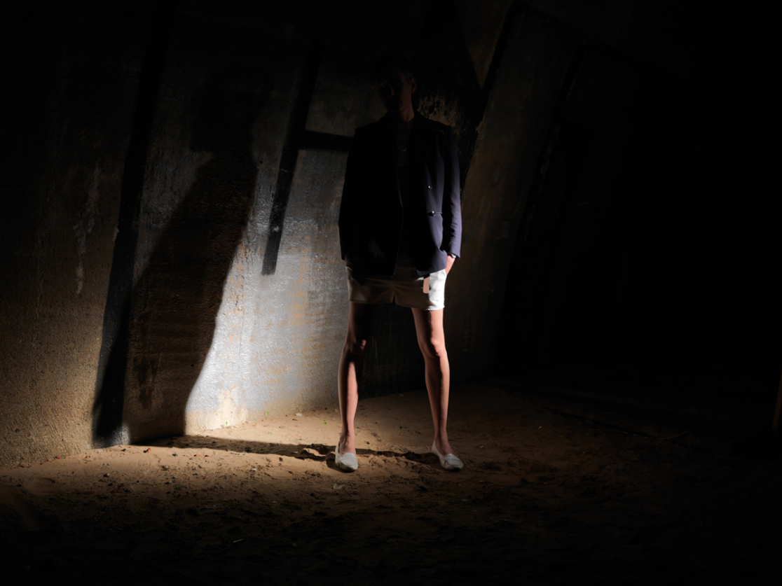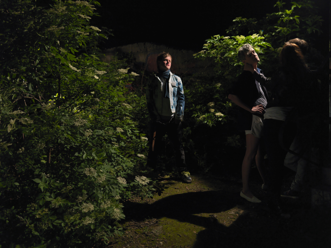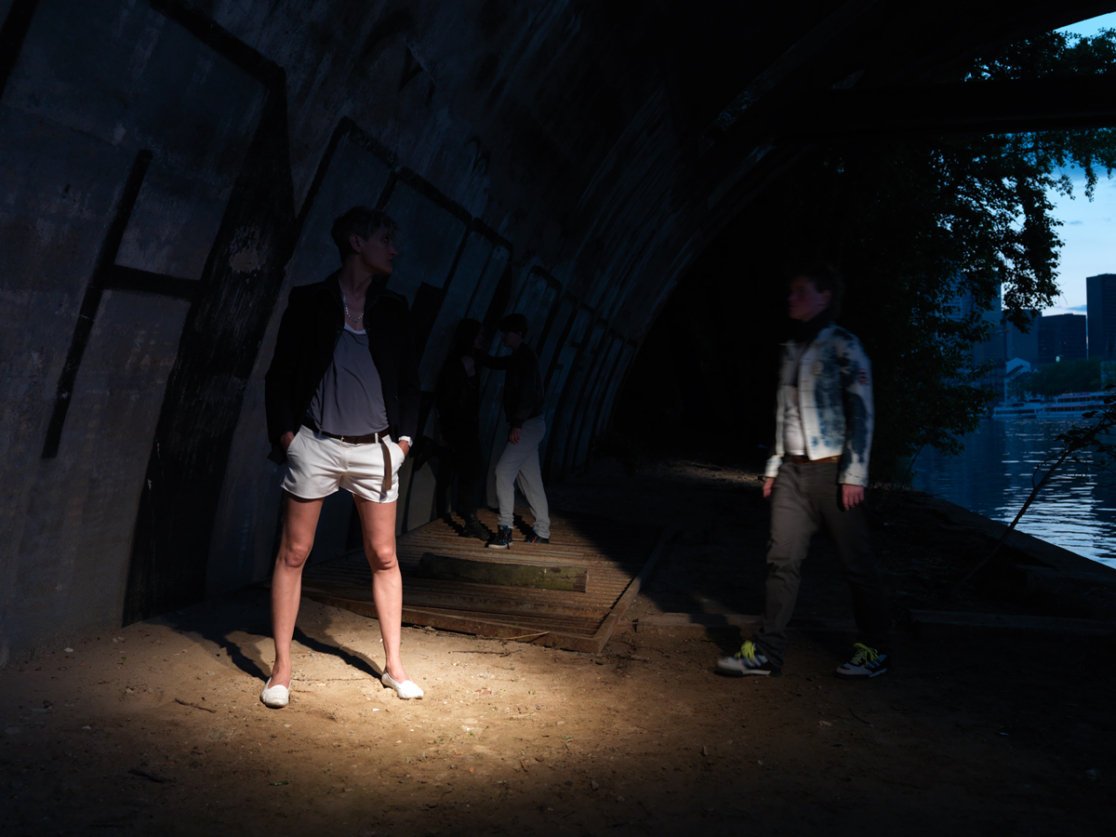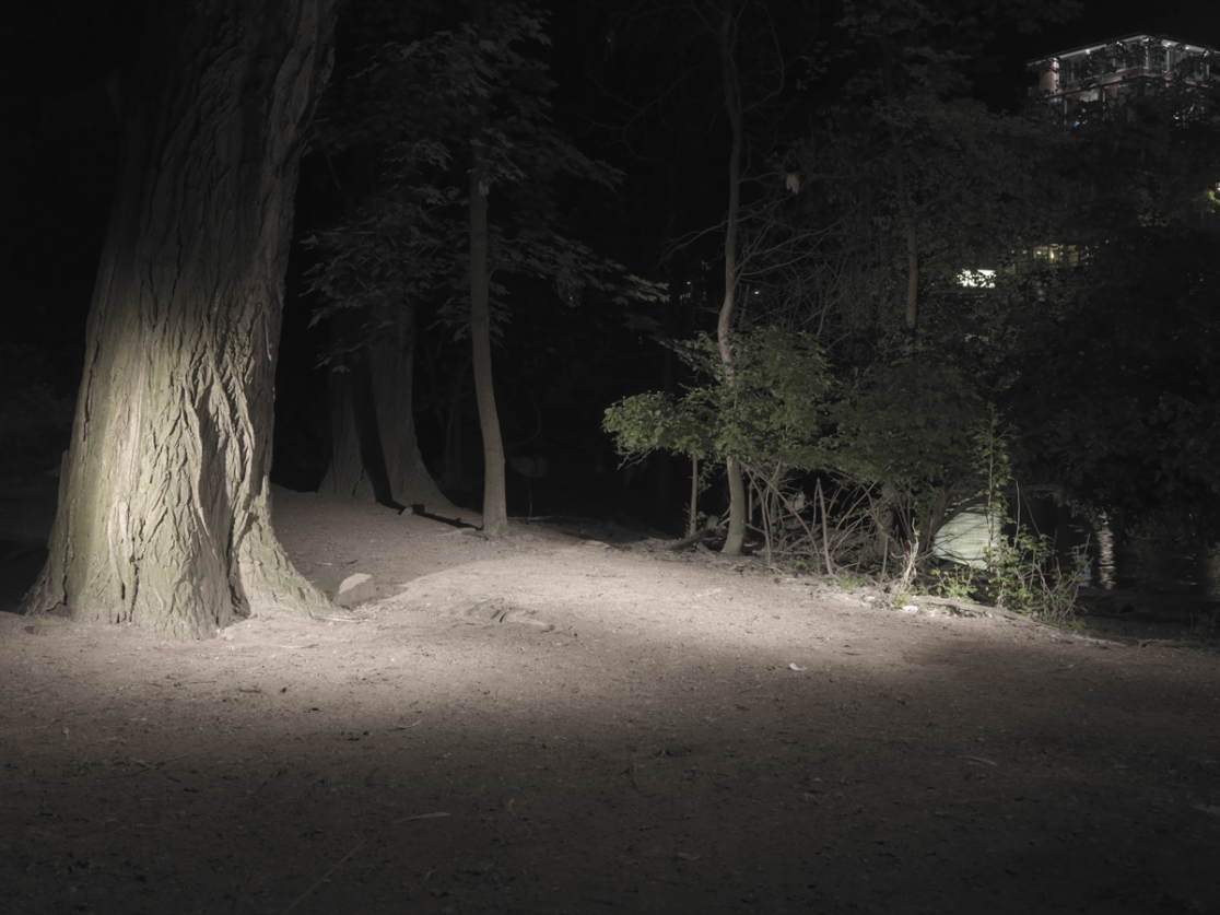 The series of seven photographs called »Missing Images (From the Green Belt)« questions norms, respectively what is and remains outside the norm and therefore invisible: Missing Image is the title of each of these pictures that are numbered consecutively. The starting point of this work is the pose that is varied and tested in the photographs: what happens if feminine persons stand up with their legs apart – half challenging, half provoking, with a direct, offensive gaze? On an aesthetic level the series reminds us of the dramatically photographed fashion editorials, on a level of content, it deals with the problem of being outside: being in the public space, being outside (and not in a protected inside space) when being in the urban space, appropriating this urban space. »From the Green Belt« investigates the public space by visiting – in the photographs – the rims of the urban in the night. Floodlights place bright spots in the darkness, they brighten the place that is transferred into a scenery that serves a staged scene: the bank of the river, the park. Five of the pictures display the performance of the pose in different configurations – and thereby check its (sexual) potential. The staging refers to the specific choreography of encounters at places like public cruising areas, it proves that these places can be considered areas of possibilities of queer desire. This impression is supported by the intense color of the pictures. The almost lurid green of the bushes where the female protagonists linger seems to transgress the border of the picture. In harsh contrast to that two more photographs concentrate on the place and the absence of an event. The colors are faded, the images exposed longer. The surroundings become visible in the half-light. These pictures deal with the loss of the images as well as with the possibility of violence and gay bashing, that transforms cruising areas to crime scenes. The scenes and places, produced performatively in the photographs, point to the potential of real places of queer culture: even though Tess’ work is not at all documentary, her images remind us of pictures like the Pier Photographs 1975–1986 by the chronicler of New York piers, Alvin Baltrop, who has been rediscovered only lately. Like »Dad Dracula is Dead« the series of photographs resembles a test arrangement with which the analysis of and the longing for missing images is started. (Maja Figge)